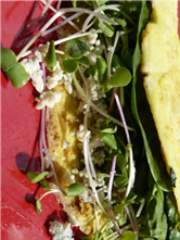 Heat non-stick skillet and cover with oil or butter. Add 2 eggs and cook until mostly set. Carefully flip and top with your favourite cheese, fresh spinach, salt and pepper and radish microgreens. Optionally top with salsa and sour cream. Enjoy!